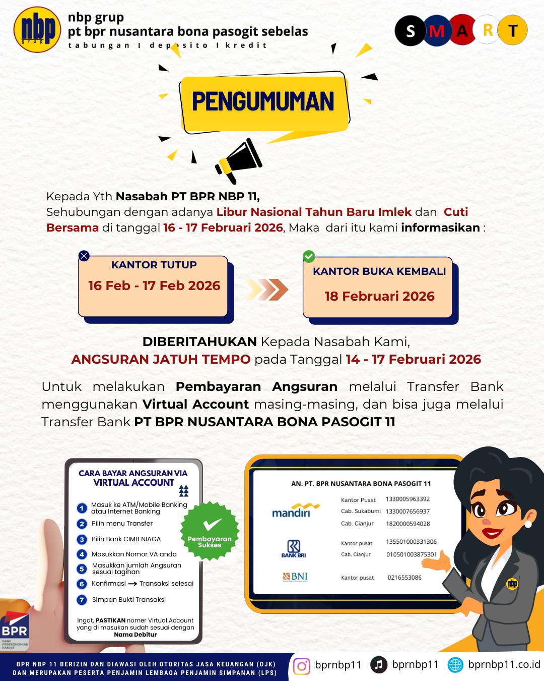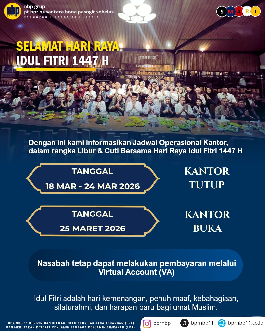 Dengan menghadirkan pelayanan cepat dan solusi finansial yang berorientasi kebutuhan nasabah, PT BPR NBP 11 terus mendukung pertumbuhan usaha mikro, kecil, menengah, serta perekonomian masyarakat di berbagai wilayah.